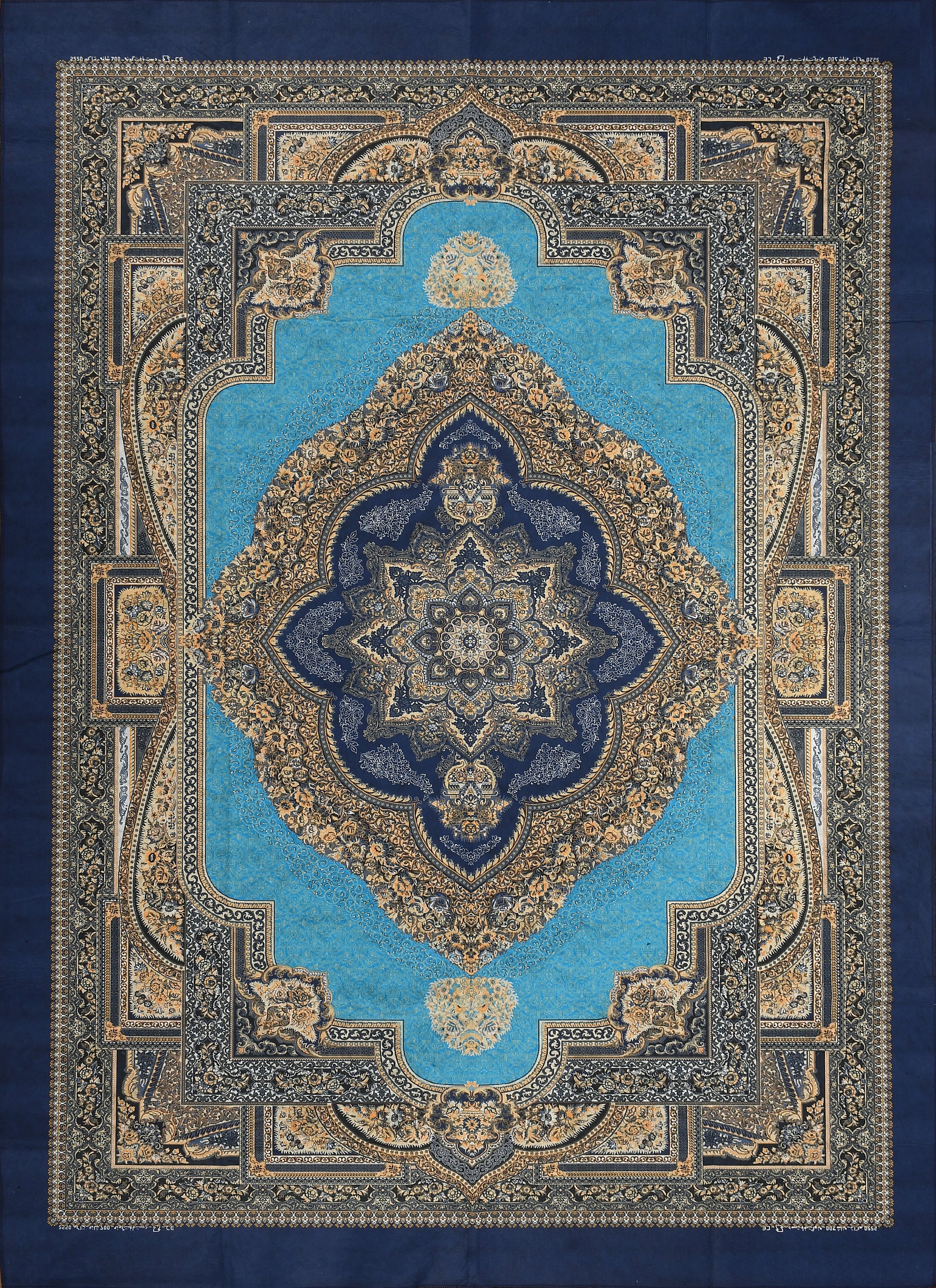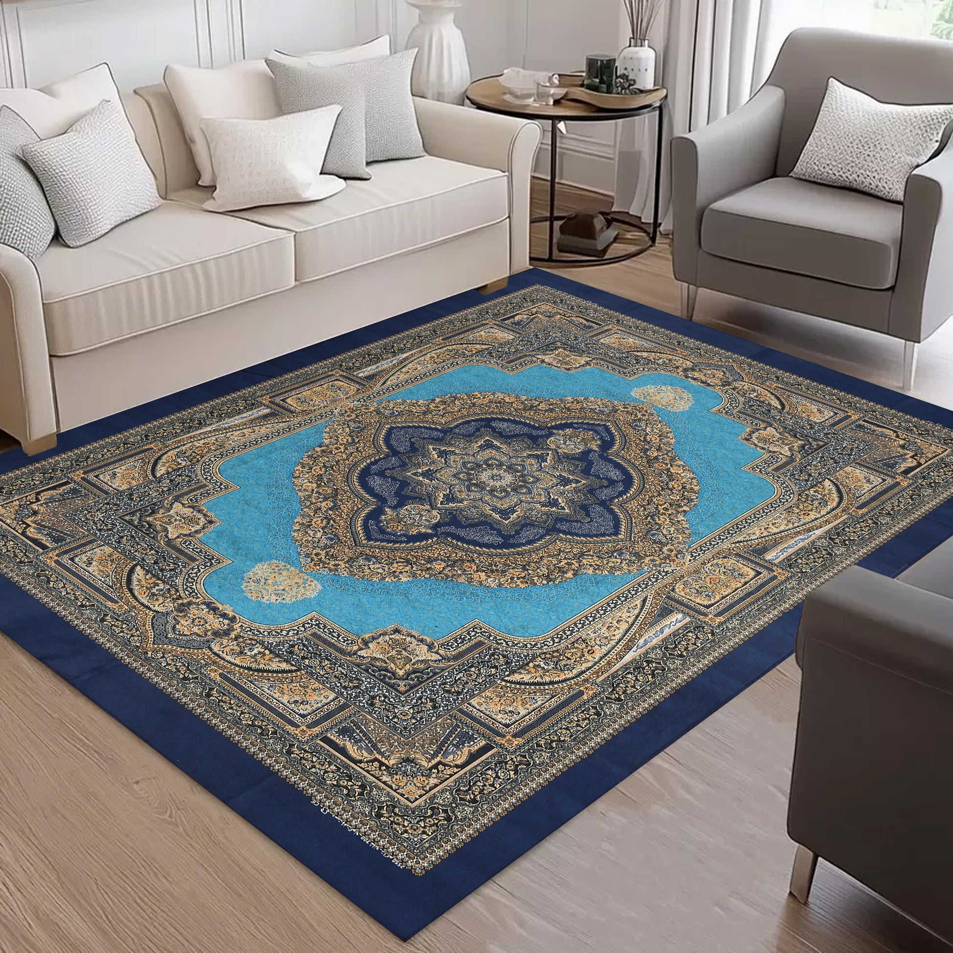Elevate your living space with this beautifully crafted 5x7 feet printed flat rug, designed to blend elegance with functionality. Featuring a rich traditional pattern in shades of blue, gold, and beige, this rug adds a timeless charm to any room.